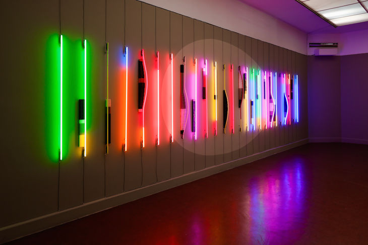 Luz de neón. Transformadores y secuenciadores. Tejido con cuentas de acrílico facetadas y tanza sobre estructuras de madera revestidas en oro a la hoja. Pintura y dibujo sobre pared.