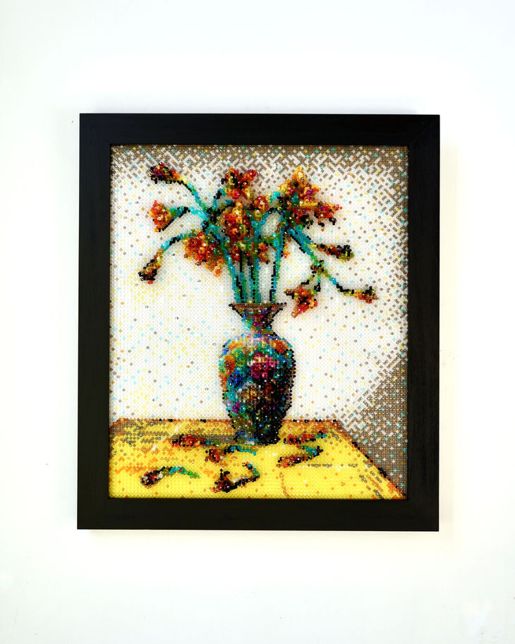 Tejido con cuentas acrílicas facetadas encastrables. Cristales. 95 x 83 x 4 cm.