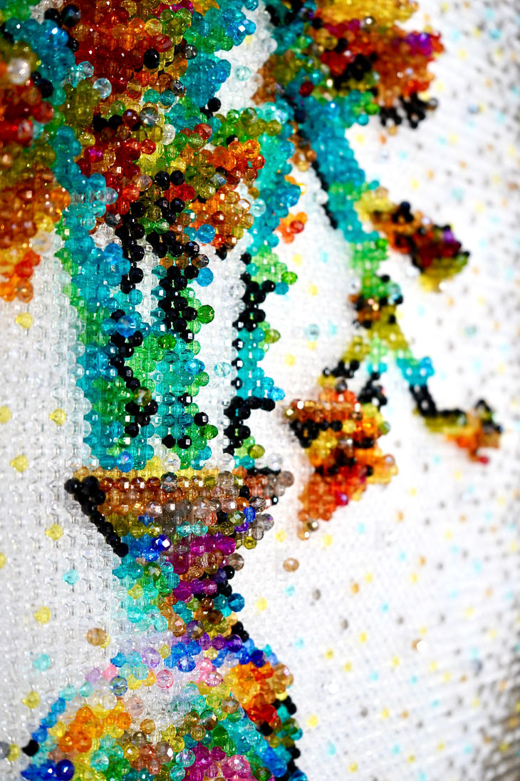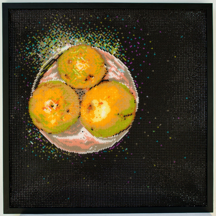 Tejido con cuentas acrílicas facetadas encastrables. 107 x 107 cm.