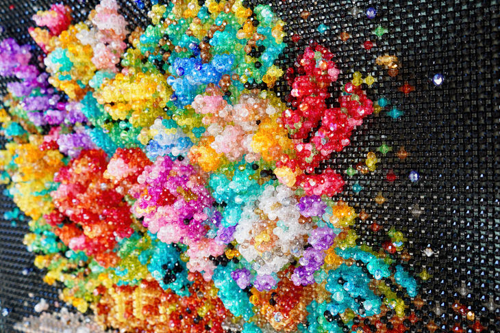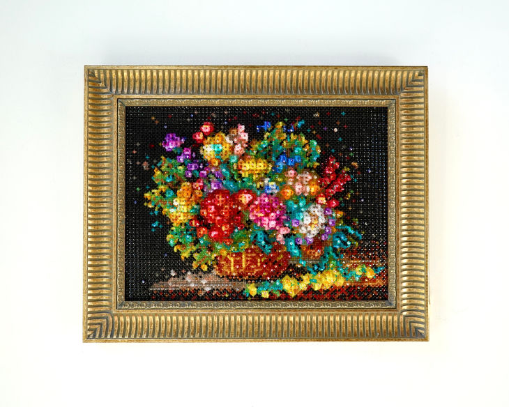 Apartir de registros fotográficos, sustituyo digitalmente las flores originales por especies nativas argentinas, tomando como referencia principal el Atlas de Botánica Argentina (Ampersand, 2022). Esta operación dio origen a un nuevo archivo visual construido mediante técnicas de dibujo y collage digital, que luego se tradujo a una imagen textil tejida punto por punto con cuentas acrílicas y cristales facetados.